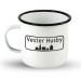 - Emailletasse weiß mit beidseitigem schwarzem Aufdruck
