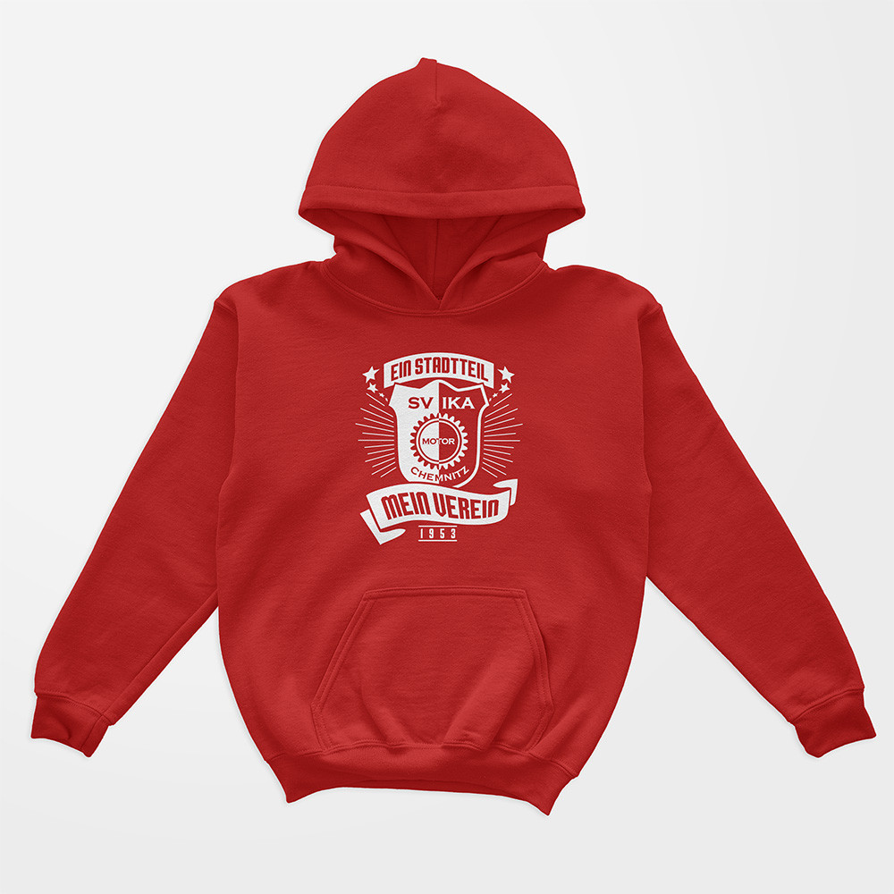 Offizieller Kids Fan-Hoodie des SV IKA Chemnitz e.V. – erhältlich in Schwarz, Weiß und Rot.