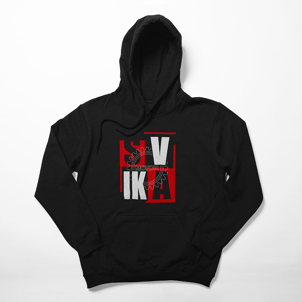 Der Hoodie zeigt ein modernes Split-Design, bei dem die Buchstaben SV IKA mit dem traditionellen Motor-Zahnradlogo kombiniert werden.